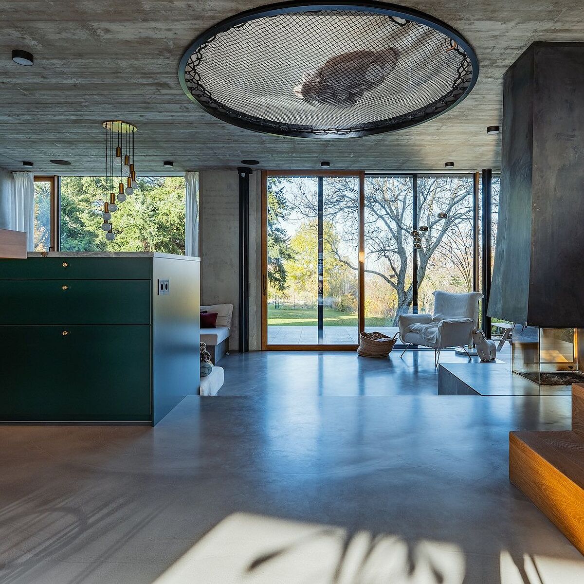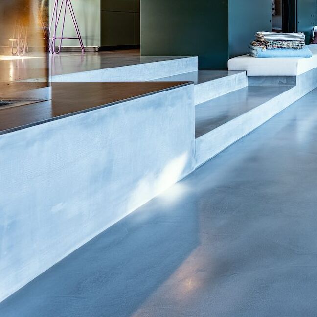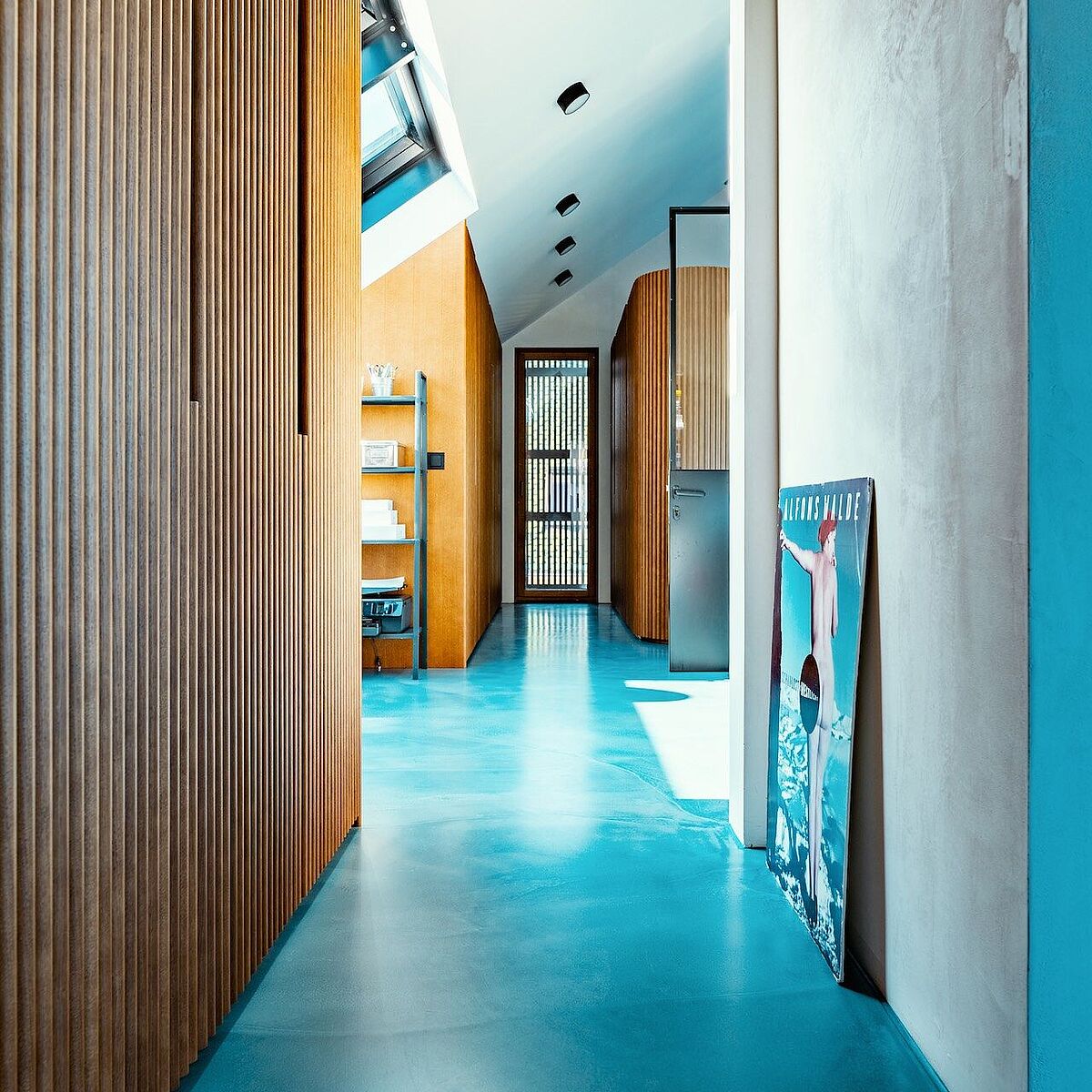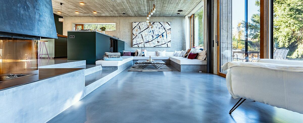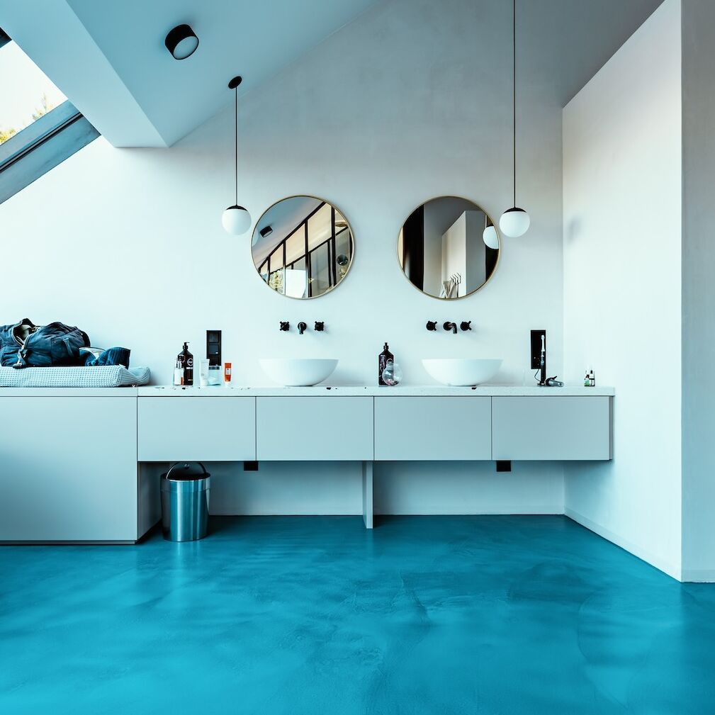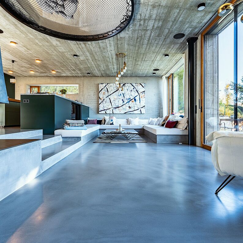 Ein modernes, architektonisch außergewöhnliches Einfamilienhaus im Wiener Umland fasziniert mit erfrischendem blauen und stilvollem grauen panDOMO Floor Böden.