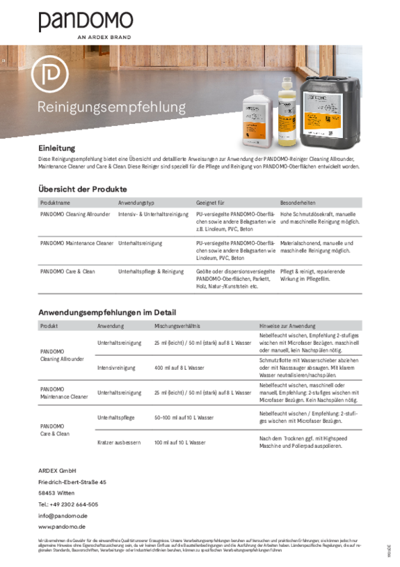 PANDOMO 表面非常耐磨,易于清洁。可以随时使用中性清洁剂进行清洗,积水应立即吸干。PANDOMO 还提供自己的清洁产品,详细信息请下载我们的清洁手册。