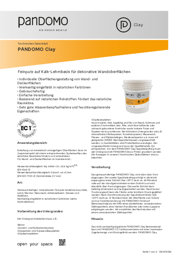 需了解 PANDOMO Clay 和 PANDOMO Wall 的应用,请咨询您选择的专业油漆或抹灰公司。